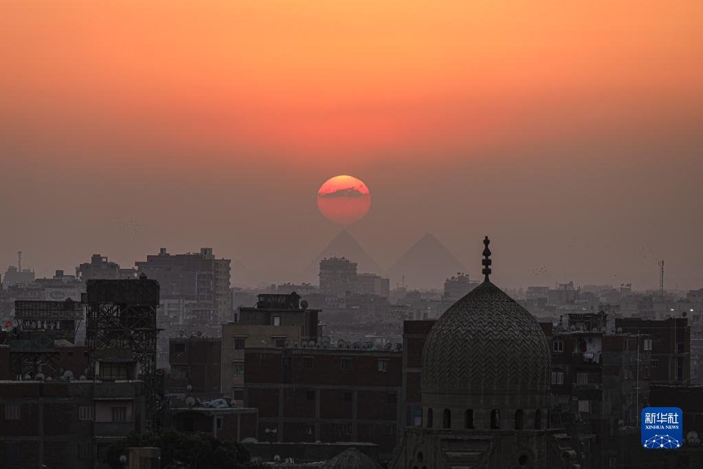 这是4月15日在埃及开罗拍摄的吉萨金字塔群日落景色。