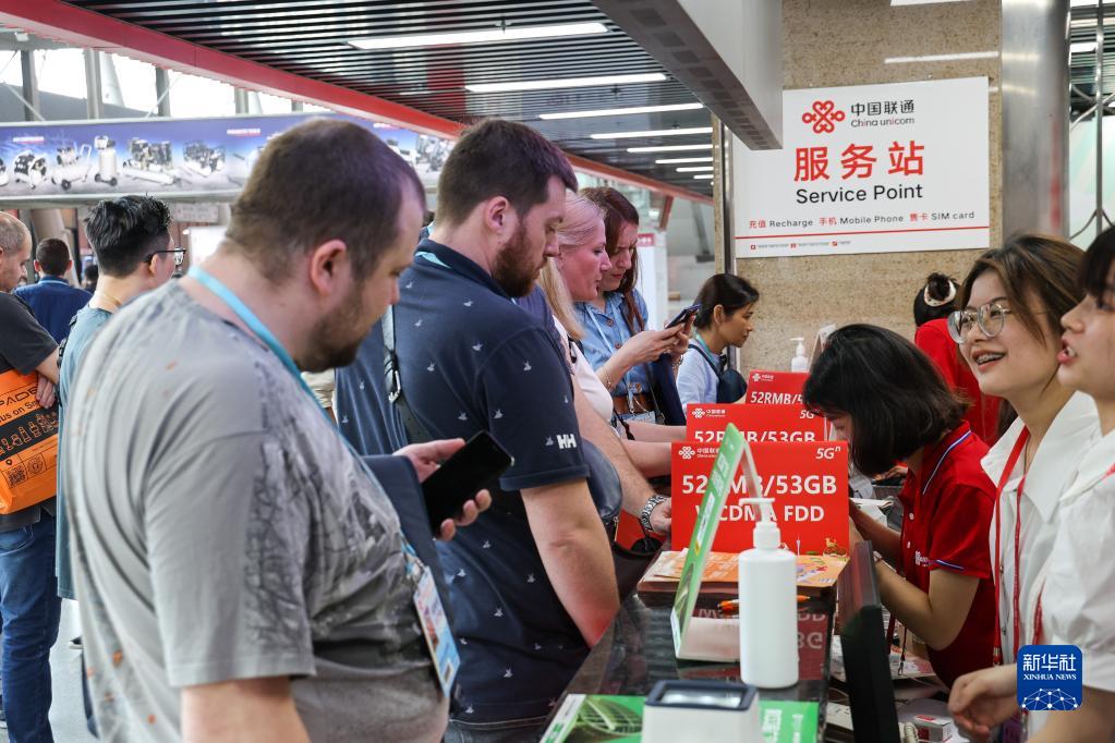 4月15日,客商在广交会展馆内设置的通讯服务点选购电话卡。
