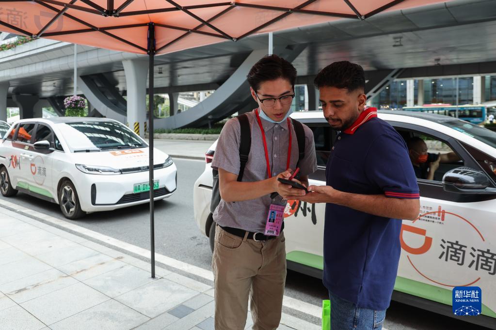 4月15日,一位外国客商在服务人员帮助下学习使用网约车打车软件。本届广交会专门在场馆区域设置了网约车乘车点,方便客商便捷通行。