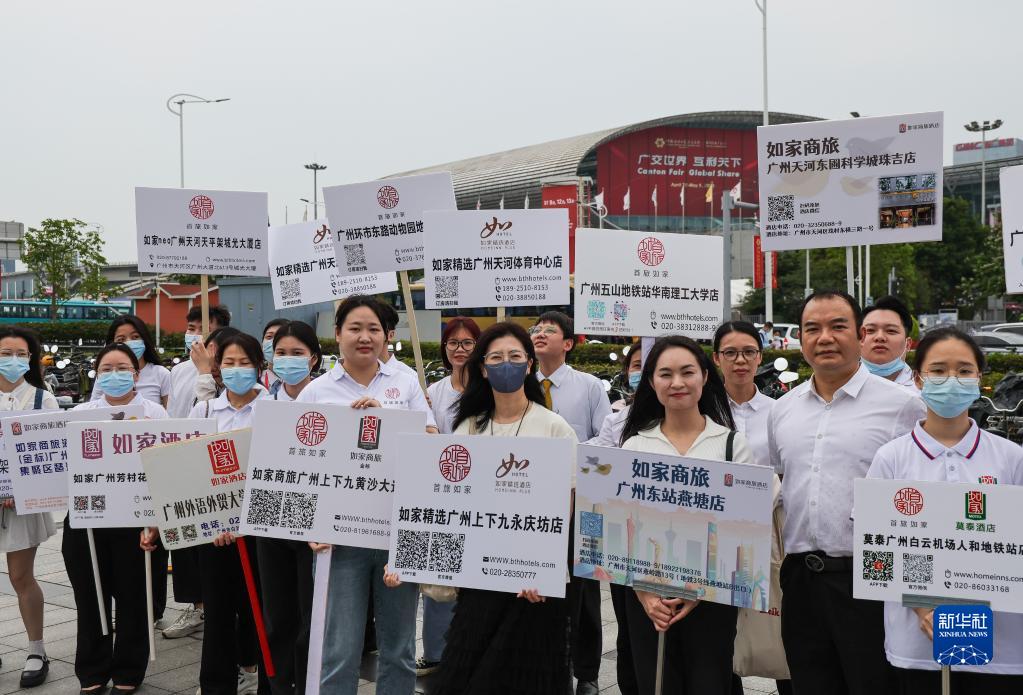 4月15日,酒店服务商在广交会展馆外集中指引宾客乘坐巴士返回酒店。