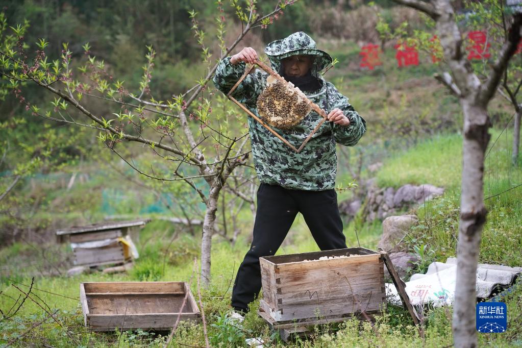 村党支部书记吴竹林在查看蜂箱(4月6日摄)。