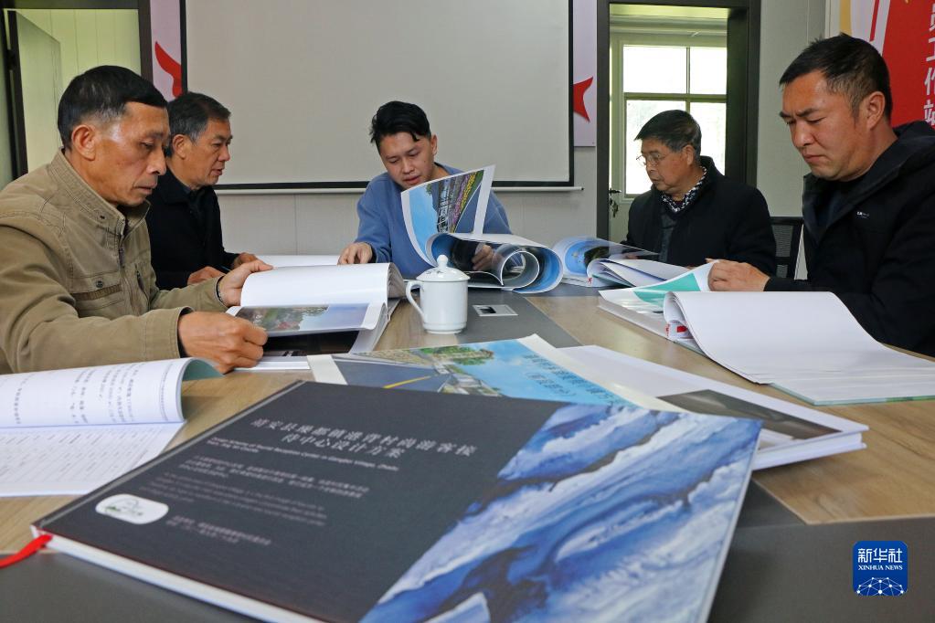 包希孟(中)和公司成员一起讨论旅游项目的设计方案(4月7日摄)。