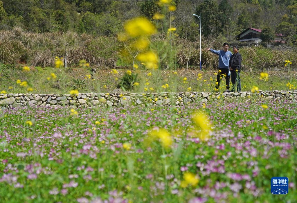 包希孟(左)与村民商量一片花田的规划(4月7日摄)。
