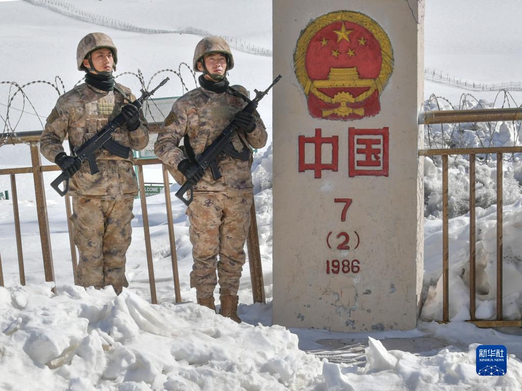 4月13日,周林平(右)和高光辉在中国和巴基斯坦边境7号界碑处执勤。