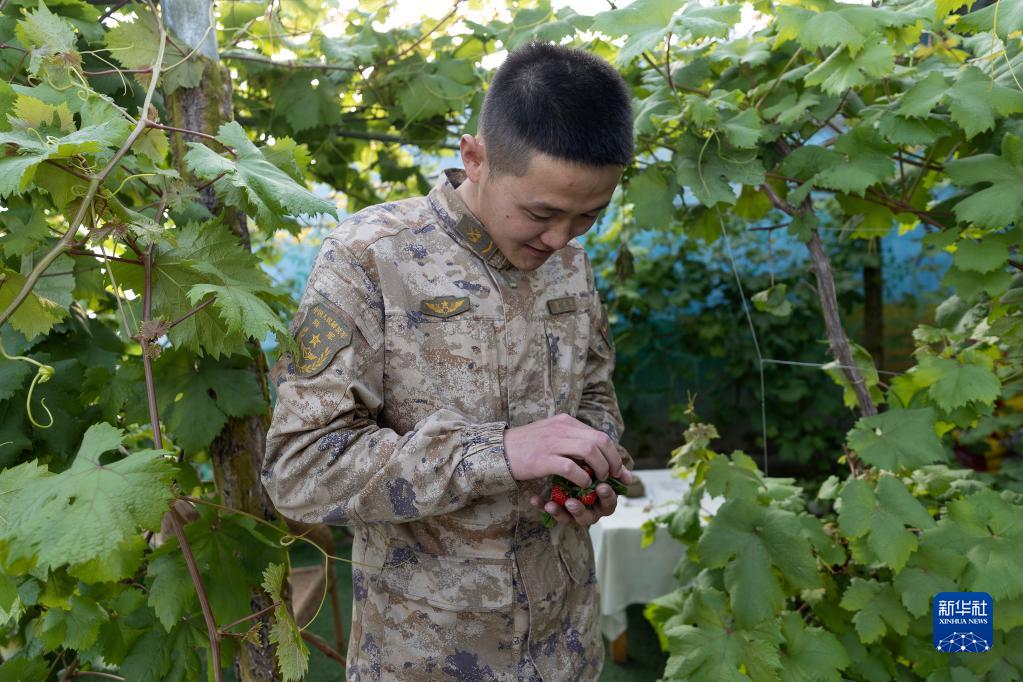 4月13日,边防连战士董兴森手捧刚刚采摘的草莓。
