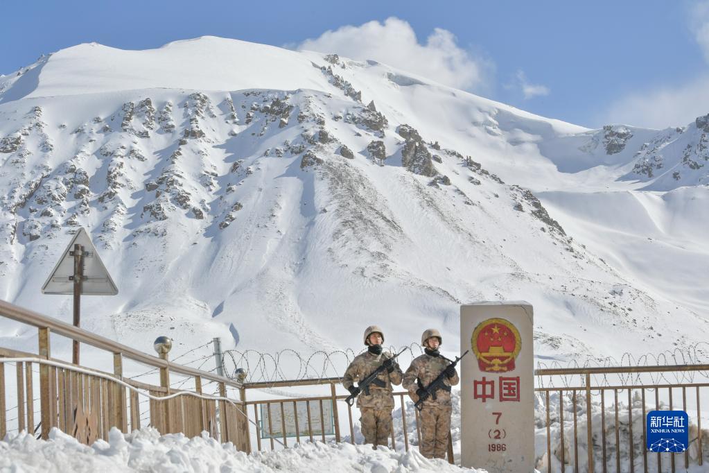 4月13日,周林平(右)和高光辉在中国和巴基斯坦边境7号界碑处执勤。