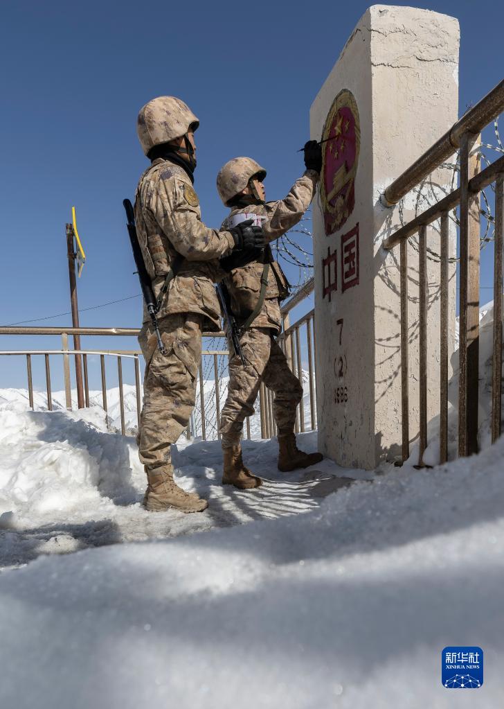4月13日,周林平(右)和高光辉执勤时给界碑描红。