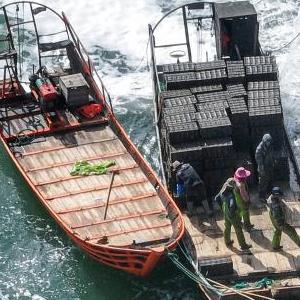 4月16日,在山东省荣成市爱伦湾海洋牧场,养殖工人从福建的船只上卸载鲍鱼。