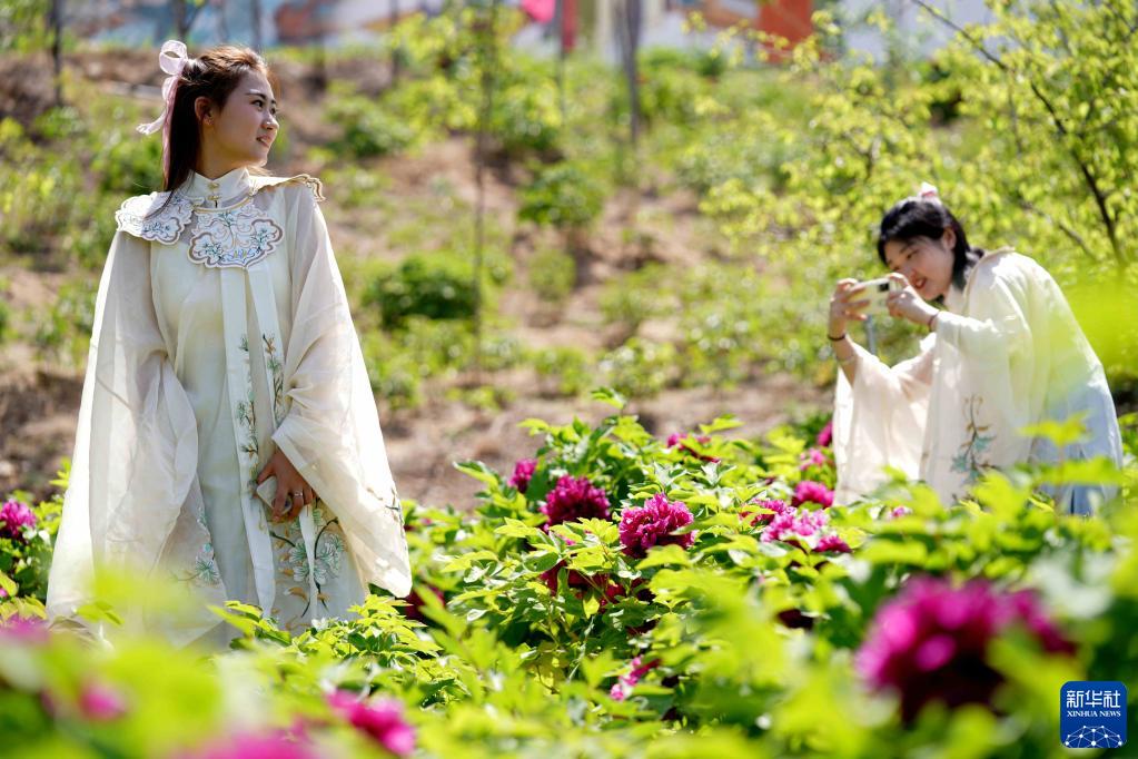 4月16日,游客在白台峪村牡丹农业产业园拍照游玩。