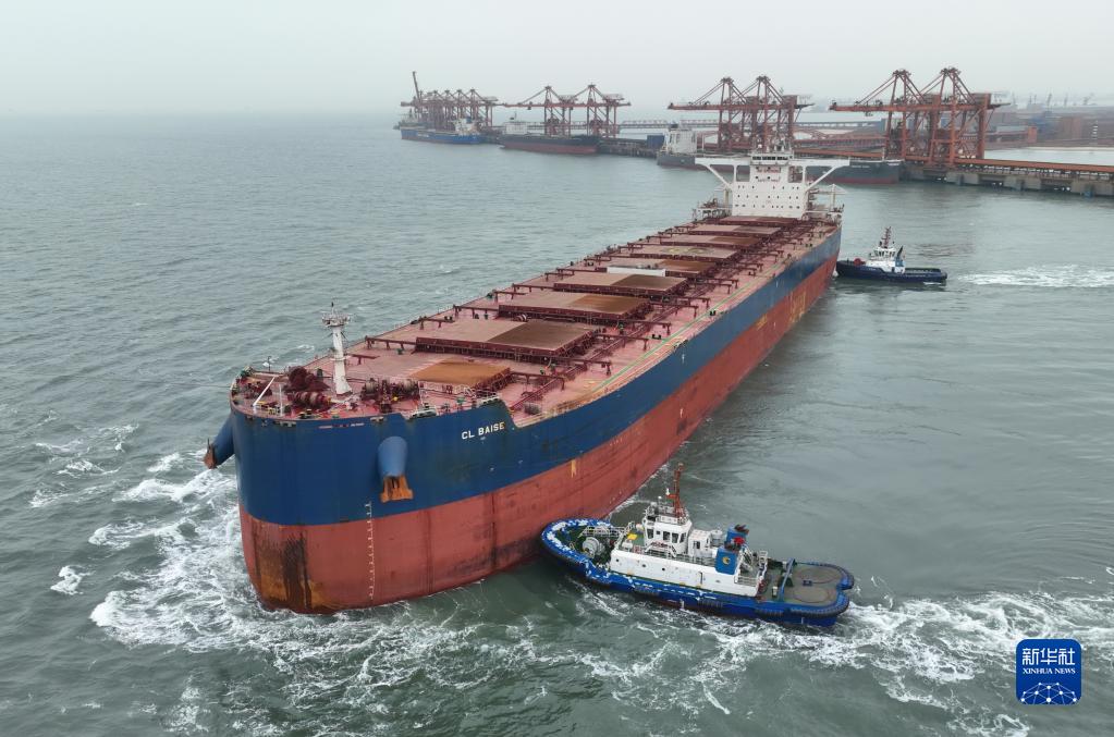 4月17日,一艘轮船在拖轮的协助下驶离唐山港曹妃甸港区矿石码头(无人机照片)。