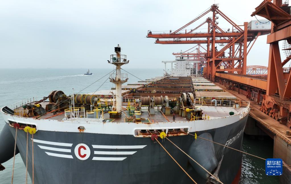 4月17日,一艘轮船靠泊在唐山港曹妃甸港区矿石码头(无人机照片)。