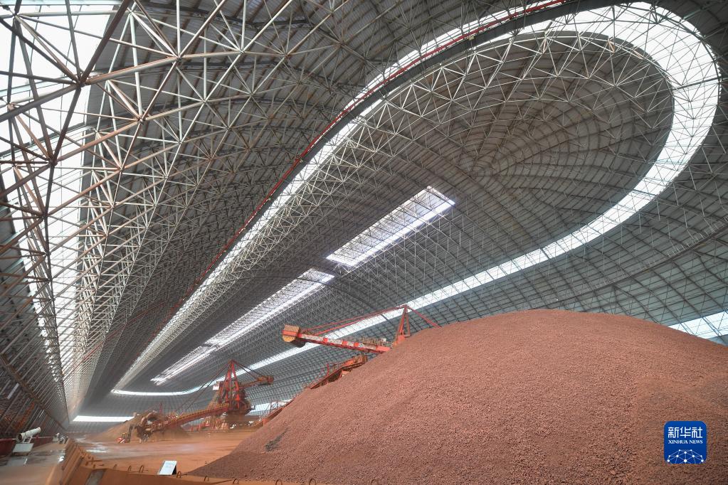4月17日拍摄的湖南省岳阳市城陵矶港“胶囊”形散货大棚内景。