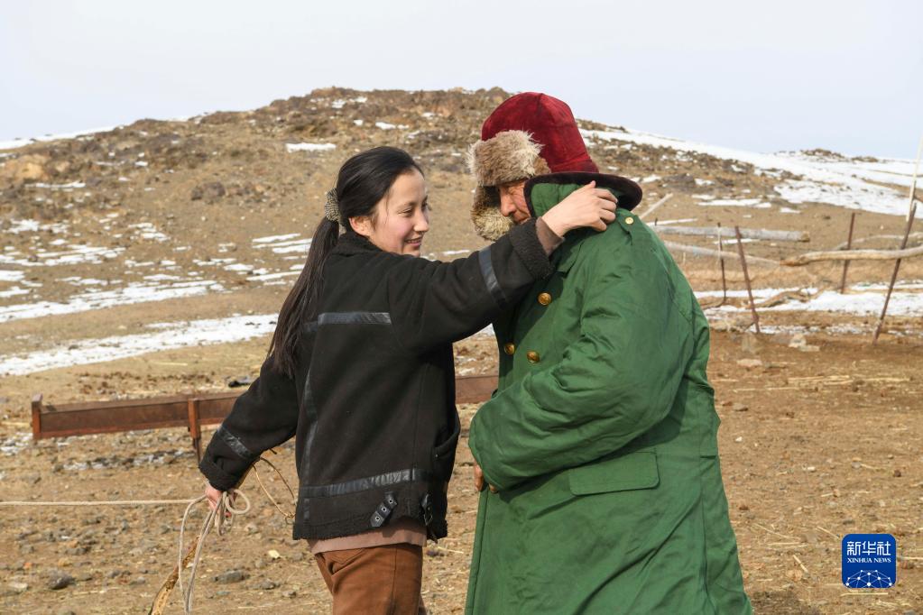 哈布得拉什么准备骑马外出寻找羊群,小女儿昆树阿克从屋内拿来厚大衣,一手牵着马,一手帮父亲整理衣领(2月14日摄)。