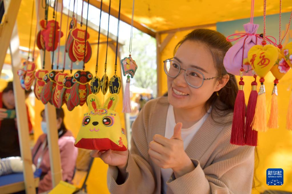 4月18日,非遗传承人在东营市清风湖黄河大集上介绍绒绣兔。