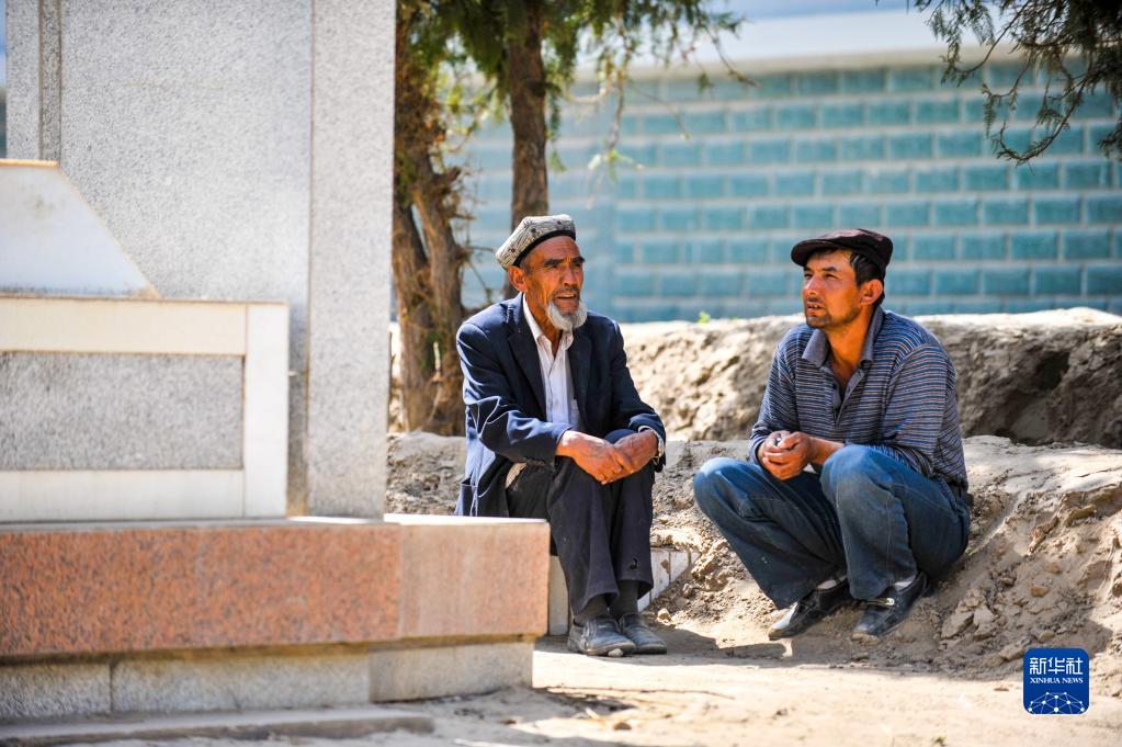 艾买尔·依提生前在陵园给儿子艾尼瓦尔·艾买尔讲当年的故事(2011年4月29日摄)。