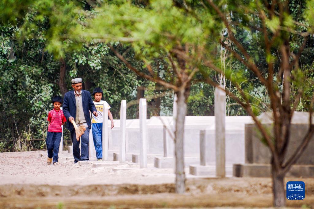 艾买尔·依提生前带着两个孙子在陵园扫墓(2011年4月30日摄)。