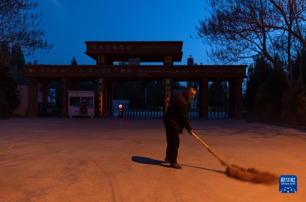 4月16日,天还不亮,艾尼瓦尔·艾买尔来到陵园大门口打扫卫生。
