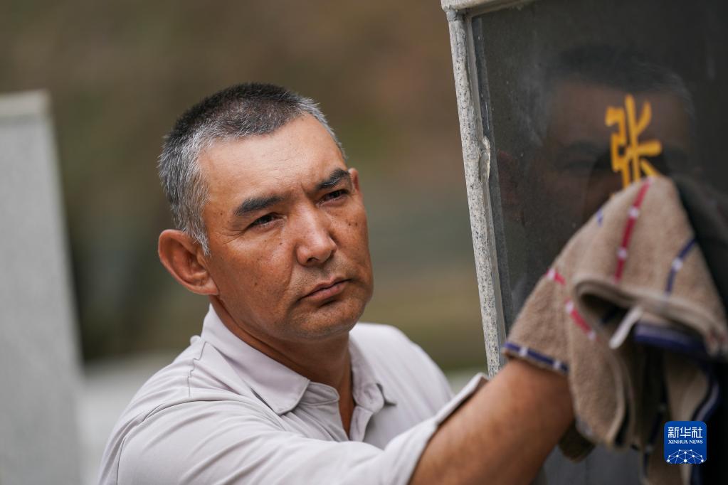 4月16日,艾尼瓦尔·艾买尔在新疆叶城烈士陵园擦拭墓碑。
