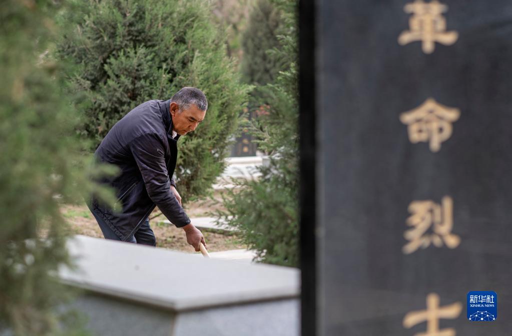 4月16日,艾尼瓦尔·艾买尔在叶城烈士陵园锄草。