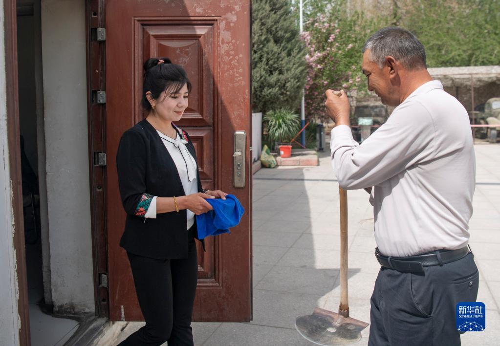 4月16日,在叶城烈士陵园,艾尼瓦尔·艾买尔(右)除草后,妻子给他递上毛巾。