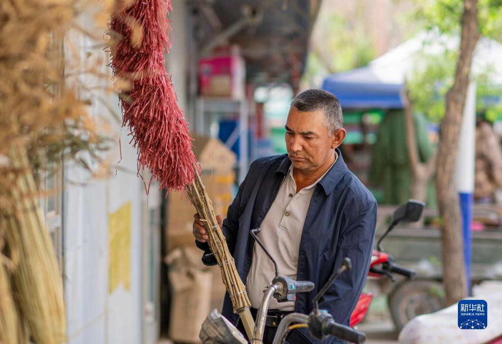 4月16日,在叶城一处农贸市场内,艾尼瓦尔·艾买尔挑选用来清扫陵园的扫帚。
