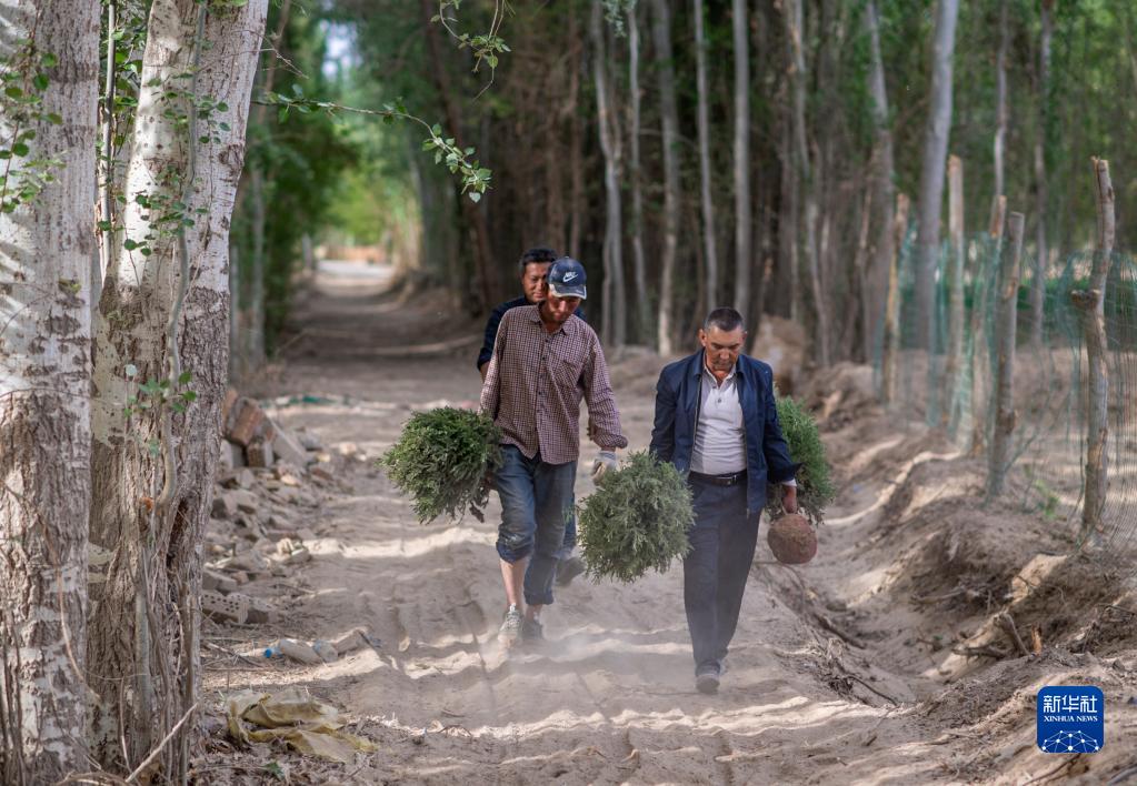 4月16日,在叶城县一处种苗场,艾尼瓦尔·艾买尔(右)带着柏树苗走回烈士陵园。