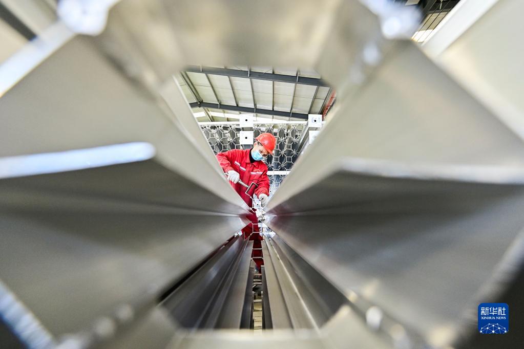 工人在山东省青州市经济开发区一家气体净化设备制造企业车间内作业(3月31日摄)。