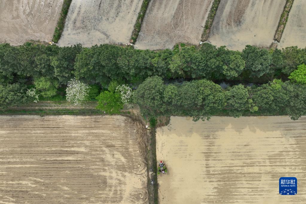 4月18日,在江苏镇江句容市天王镇戴庄村,村民驾驶插秧机进行早稻插秧工作(无人机照片)。