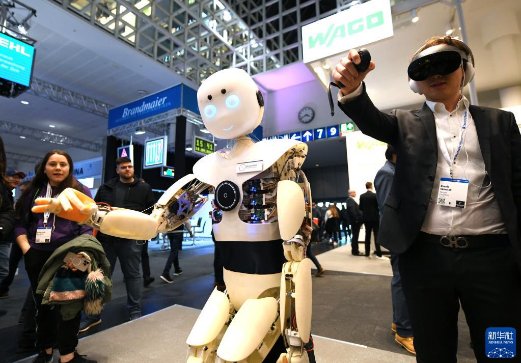 4月18日,一款智能机器人在德国汉诺威工业博览会上模仿一名男子的肢体动作。