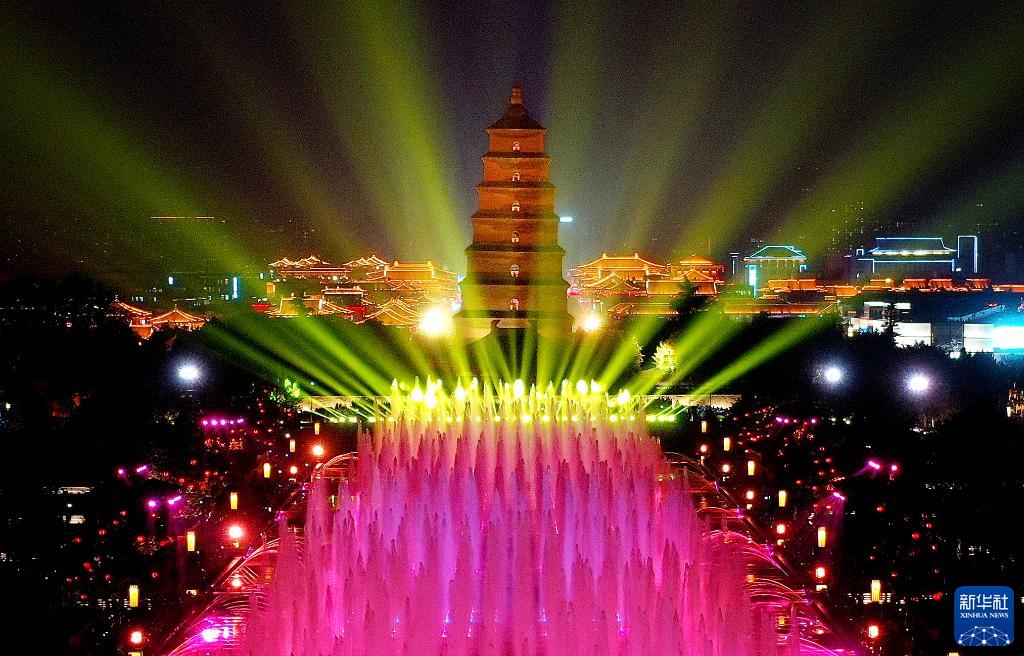 陕西西安大雁塔北广场音乐喷泉是西安旅游打卡地之一,每天会进行四场演出,吸引市民和游客前来观看。