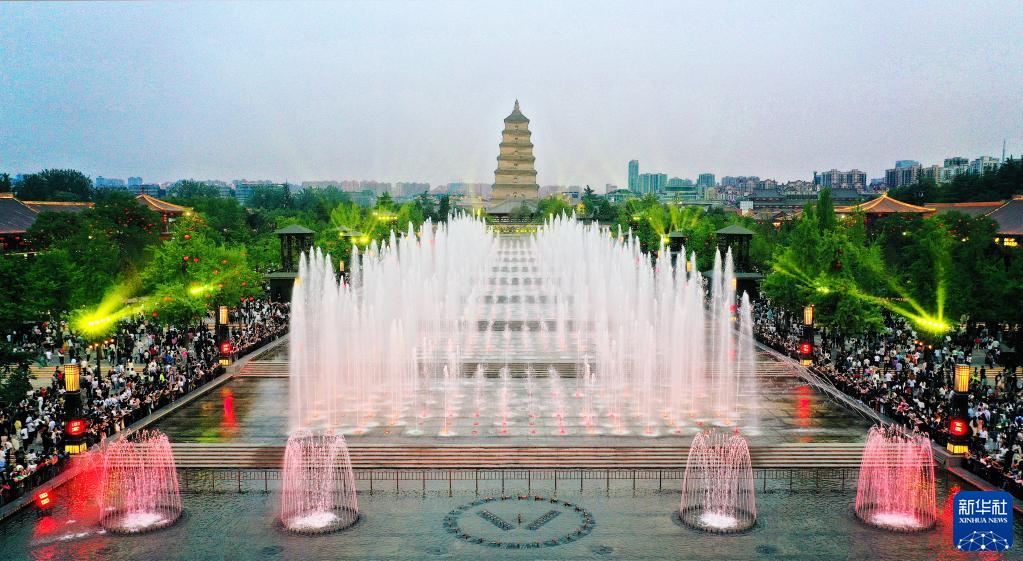 陕西西安大雁塔北广场音乐喷泉是西安旅游打卡地之一,每天会进行四场演出,吸引市民和游客前来观看。
