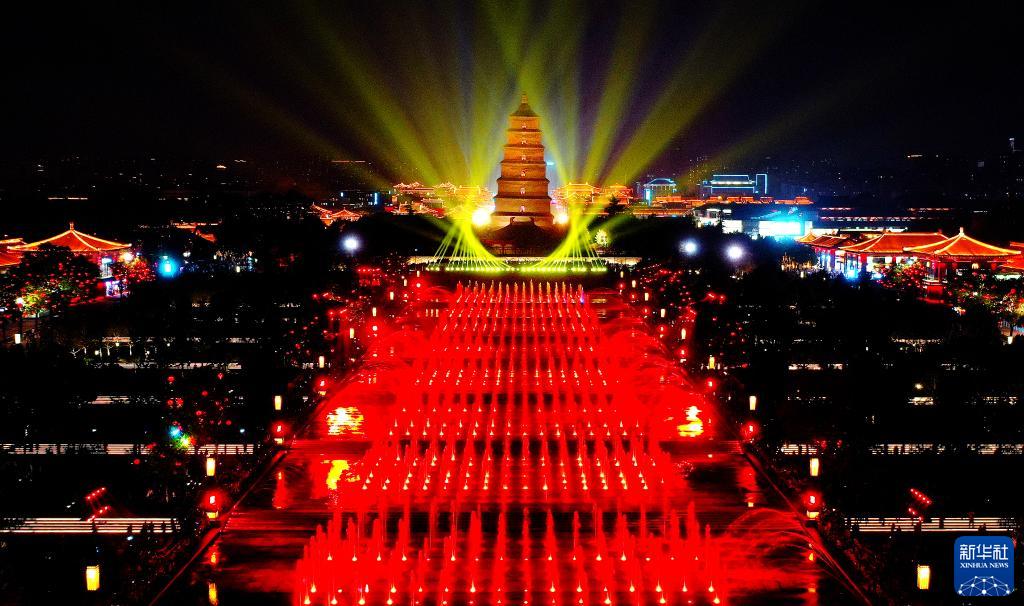 陕西西安大雁塔北广场音乐喷泉是西安旅游打卡地之一,每天会进行四场演出,吸引市民和游客前来观看。