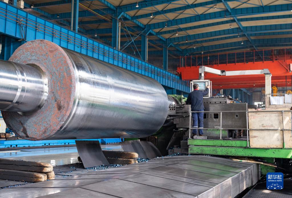 4月18日,工人在位于黑龙江省齐齐哈尔市的中国一重生产车间进行生产作业。