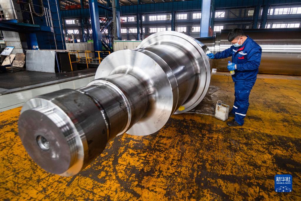 4月18日,工人在位于黑龙江省齐齐哈尔市的中国一重生产车间进行生产作业。