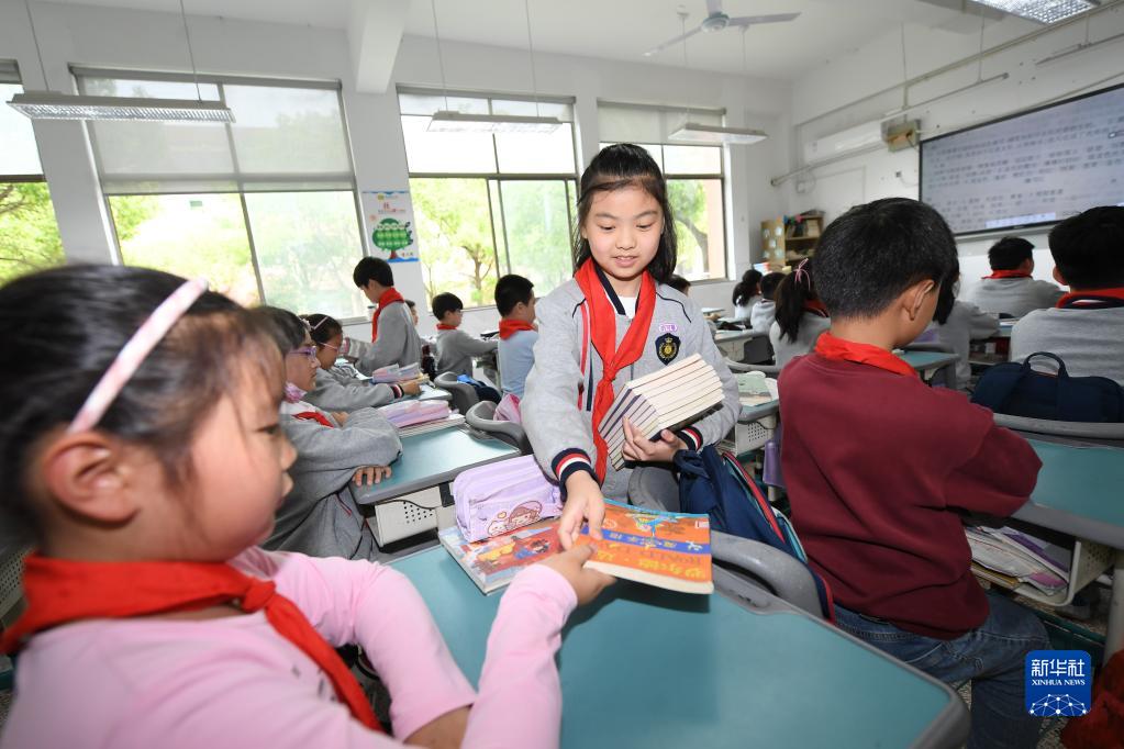 4月19日,吴兴区第一小学的学生分发课外书。该校实行班级图书借阅制度,每周为学生换一批课外书。