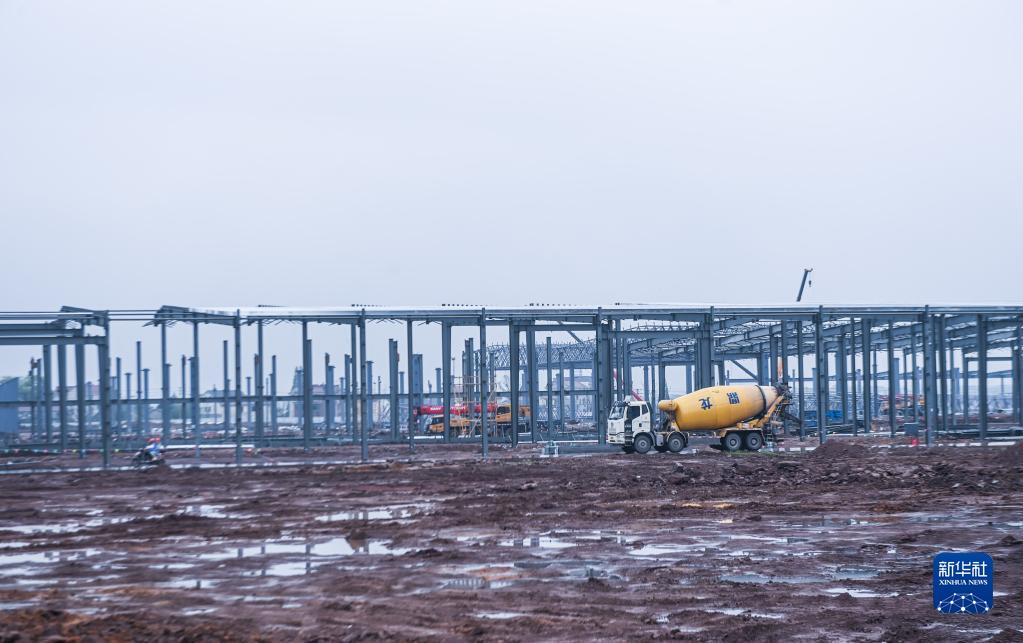 4月19日拍摄的金义新区新能源汽车零配件产业园部件总成车间、部件涂装车间施工现场。