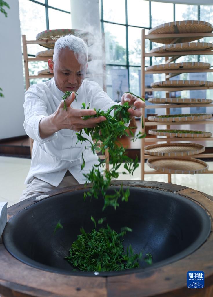 4月19日,婺州举岩茶制茶技艺非遗传承人潘金土在炒制婺州举岩茶。