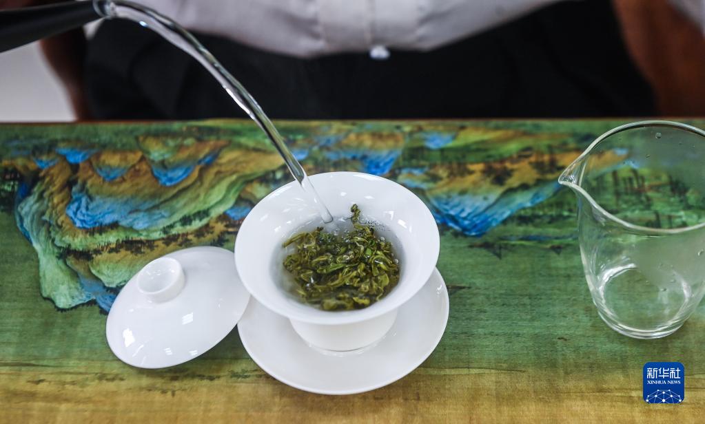 4月19日,茶艺师在冲泡婺州举岩茶。