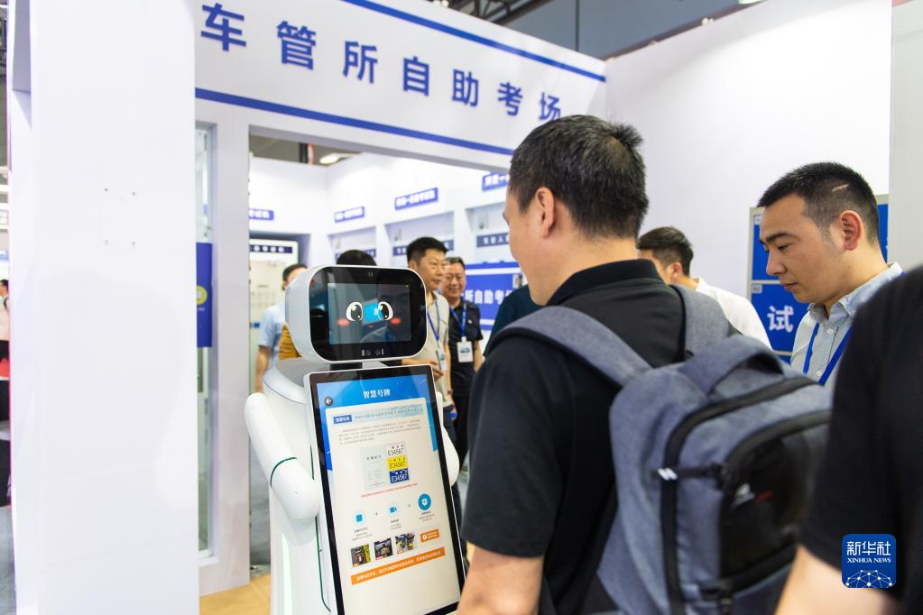 4月19日,在长沙国际会展中心,观众在体验车管所使用的机器人。