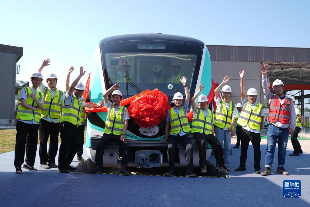 4月19日,在重庆市轨道交通18号线金鳌寺车辆段,中铁二十二局的施工人员和首列装配下线的电客车合影。