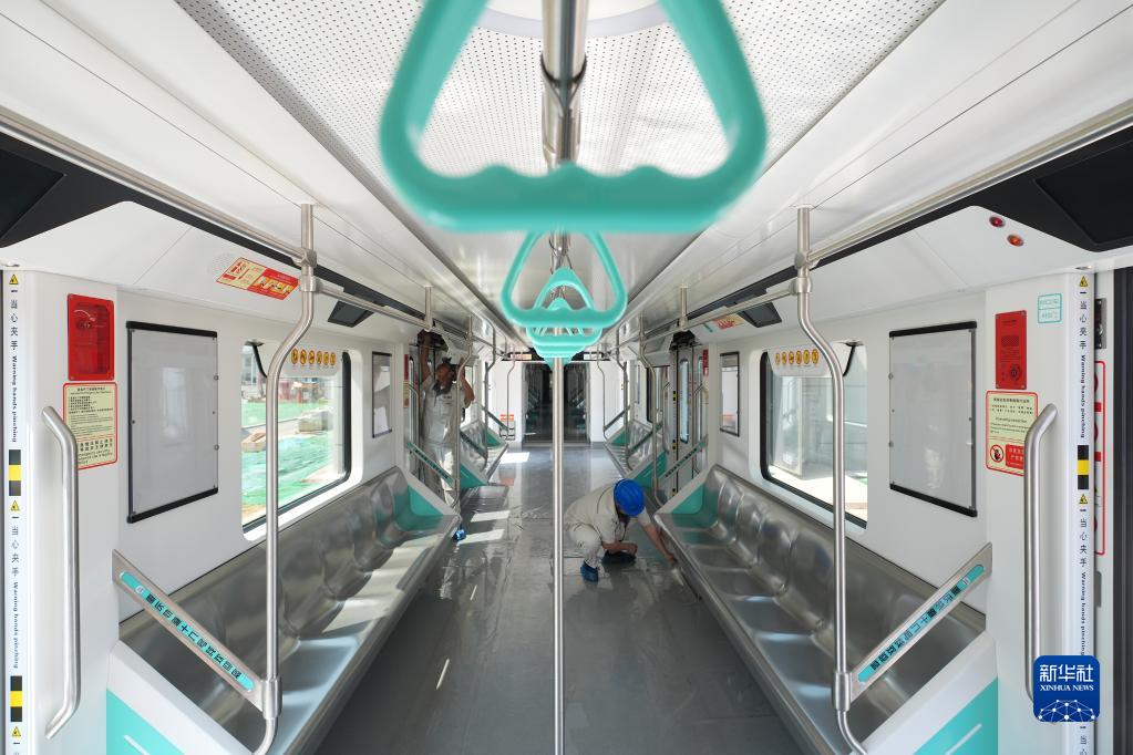 4月19日,在重庆市轨道交通18号线金鳌寺车辆段,工作人员在对装配下线的电客车进行检查。