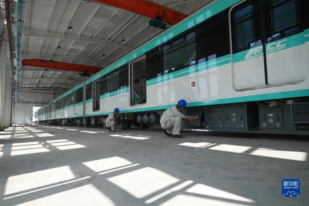 4月19日,在重庆市轨道交通18号线金鳌寺车辆段,工作人员在对装配下线的电客车进行检查。