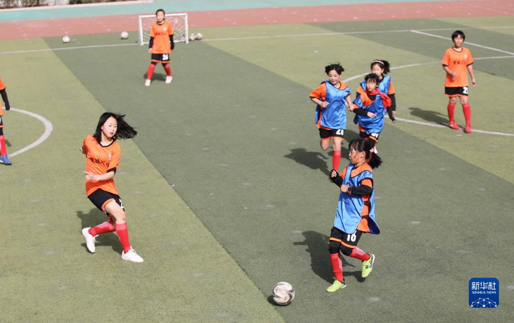 春日里,在河北省承德市宽城满族自治县第三小学,女足队员在春光里训练,感受足球运动的乐趣。近年来,宽城县积极推进“足球进校园”活动,通过在中小学开设足球课程,成立足球社团、举办足球比赛等形式,让更多的孩子接触足球,增强身体素质。