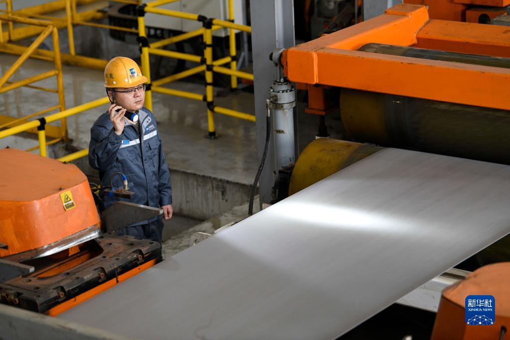 4月19日,在河北双滦一家钒钛新材料企业冷轧产品车间,工人在查看产品质量。