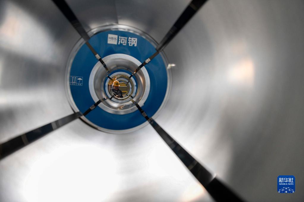 4月19日,在河北双滦一家钒钛新材料企业冷轧产品车间,工人在检查冷轧镀锌板质量。