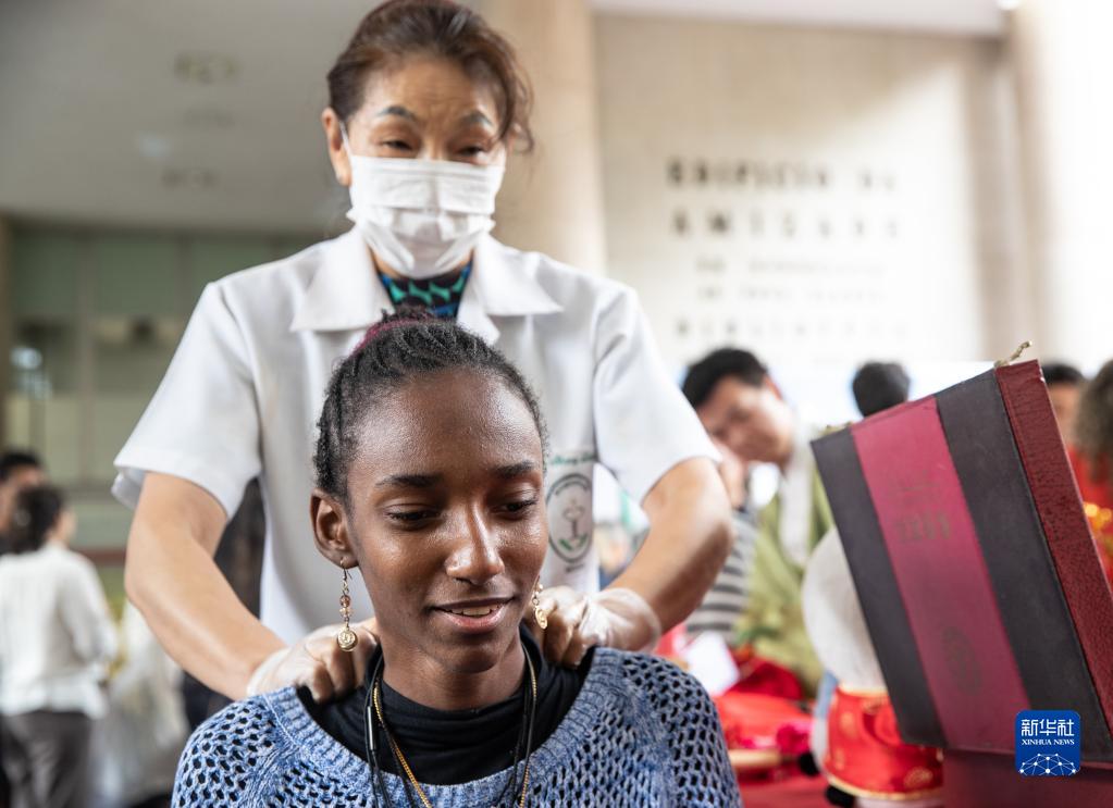 4月19日,一名学生在巴西里约热内卢体验中医治疗。