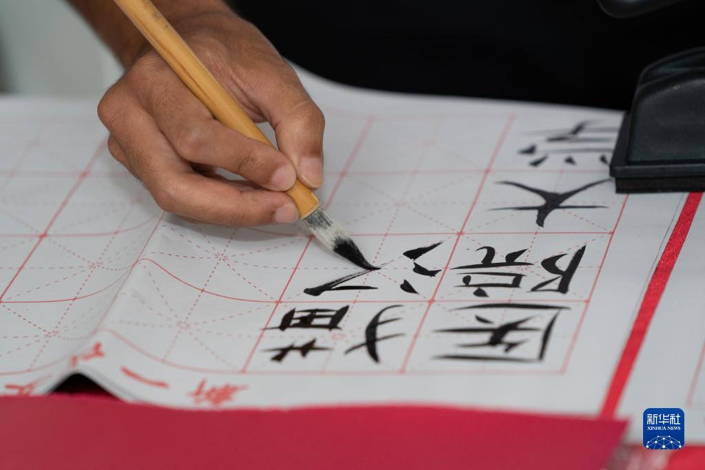 4月19日,参观者在巴西里约热内卢体验中国书法。