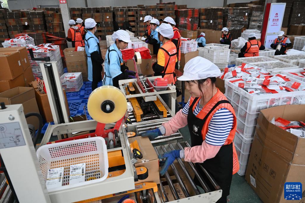 4月19日,在全国农村创业园区(基地)——宁德辰颐严选产业园的电商农产品深精加工车间,员工在包装准备发往全国各地的农产品。