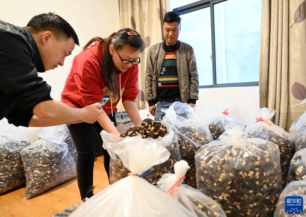 4月19日,屏南县电商创业者杨晨芬(中)在岭下乡横坑村羊肚菌菇种植户魏供岭(右一)家里收购。