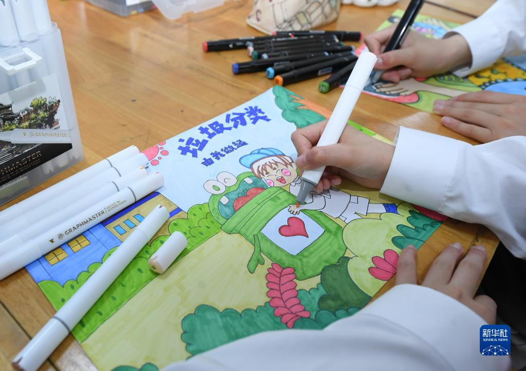4月20日,湖州新风实验小学下塘校区的学生在创作环保主题的画作。